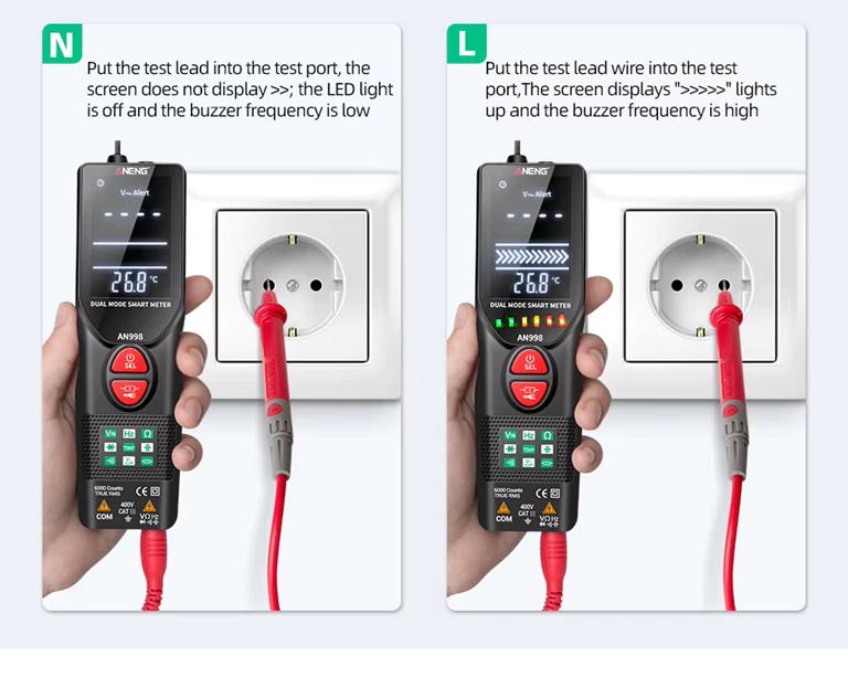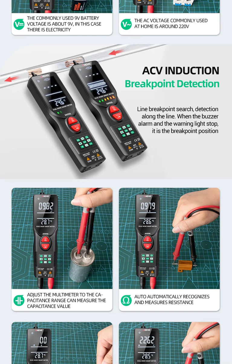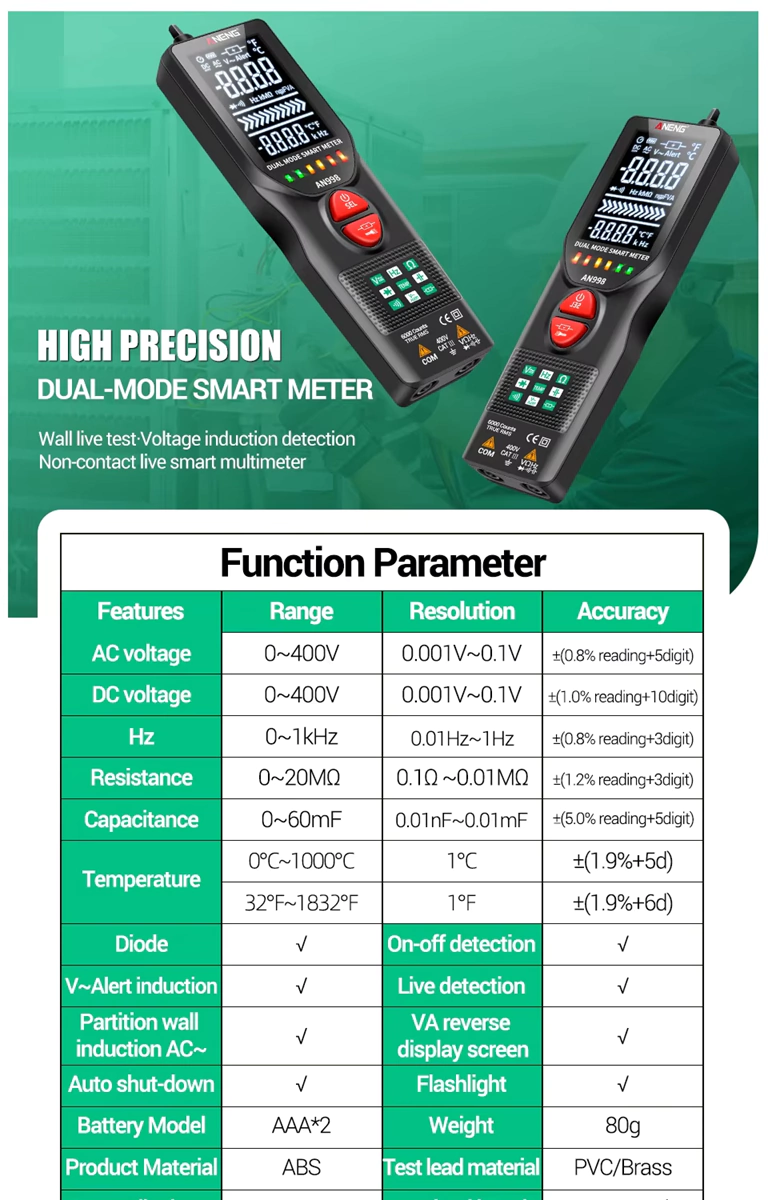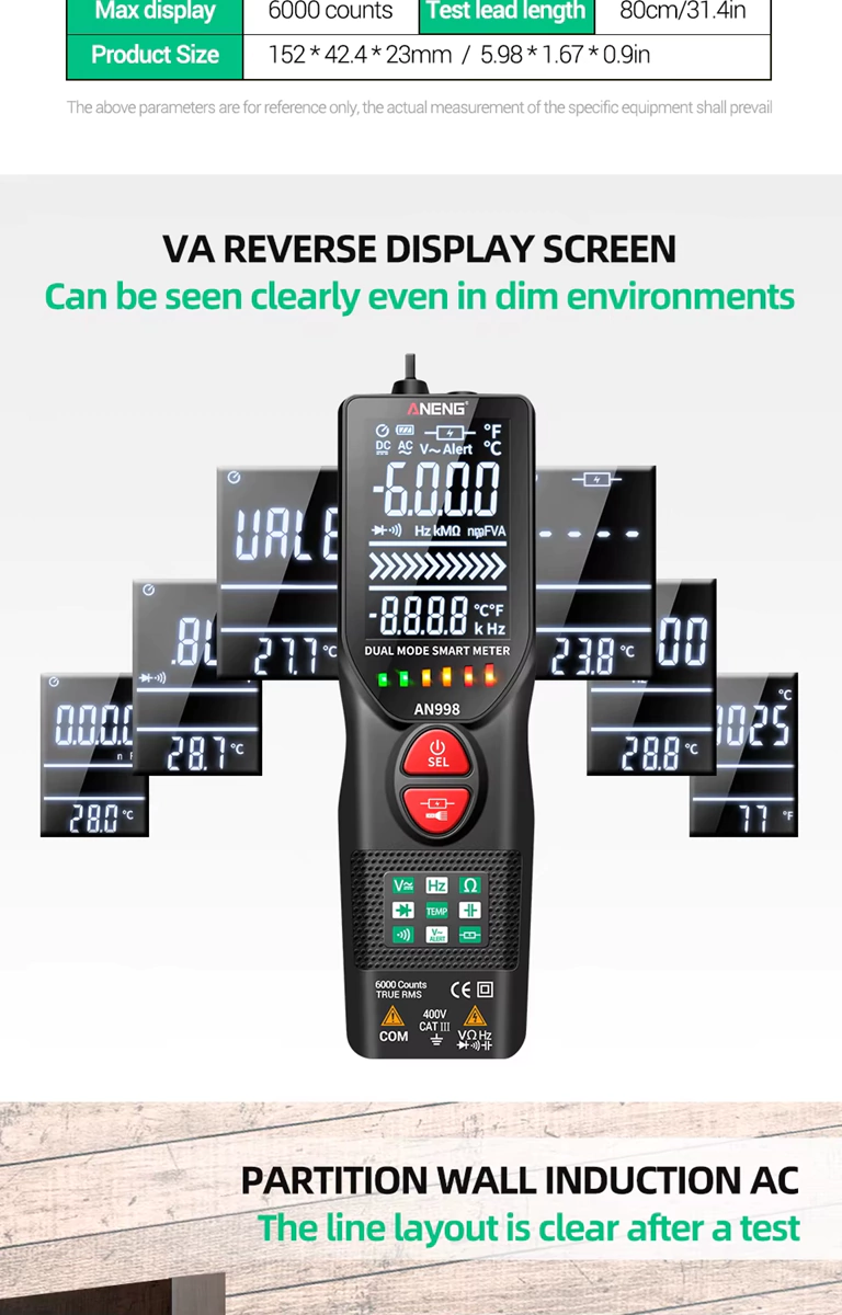 El medidor es un instrumento de medición portátil y profesional, con pantalla digital LCD y retroiluminación. Los usuarios pueden leer los datos fácilmente. El funcionamiento con una sola mano del interruptor de rango facilita la medición, con protección contra sobrecarga e indicación de Batería baja. Ya sea para profesionales, fábricas, escuelas, aficionados y familias, es un instrumento multifunción ideal.