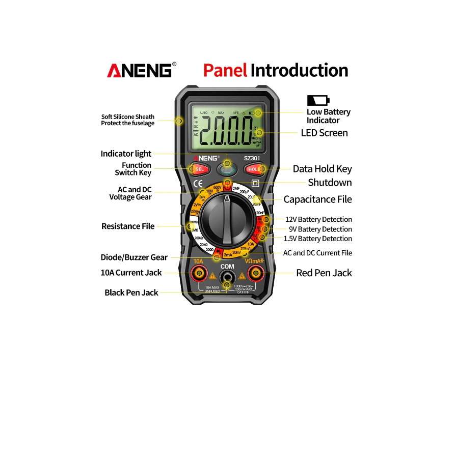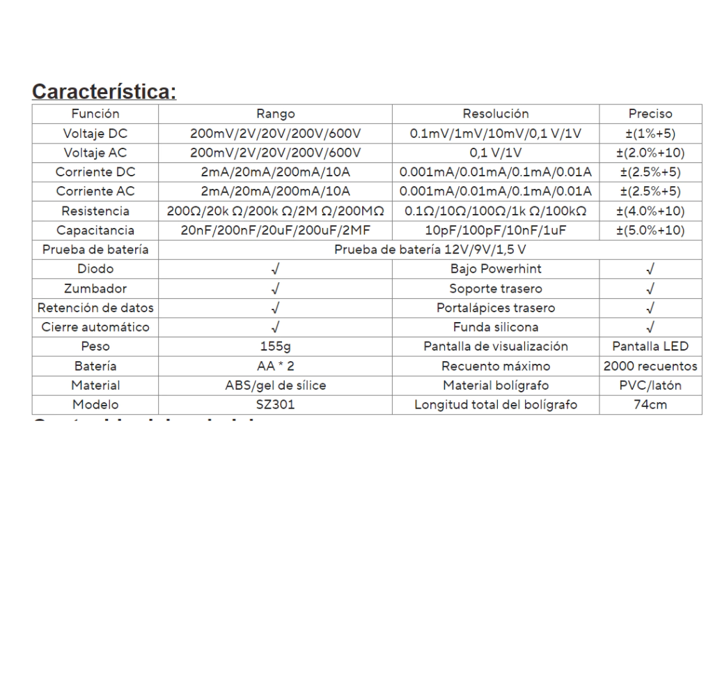 Voltaje CC: 200 mV / 2V / 20V / 200V / 600V 0,1 mV / 1 mV / 10 mV / 0,1V / 1V ± (1% + 5)